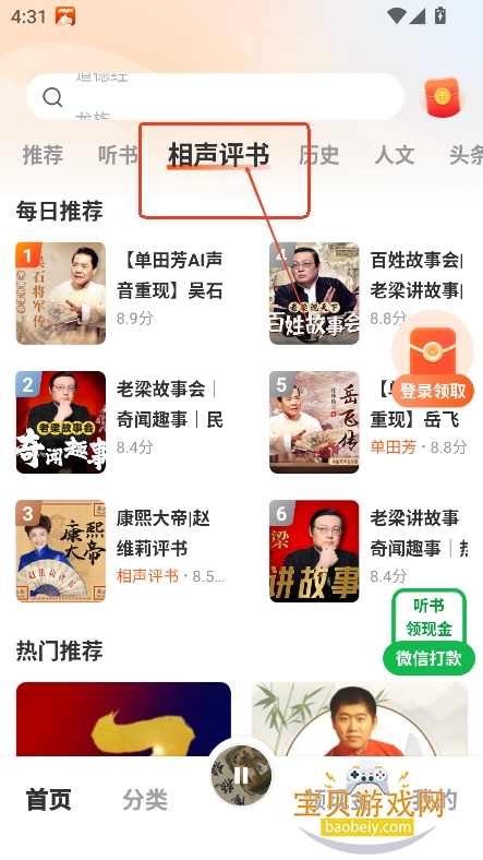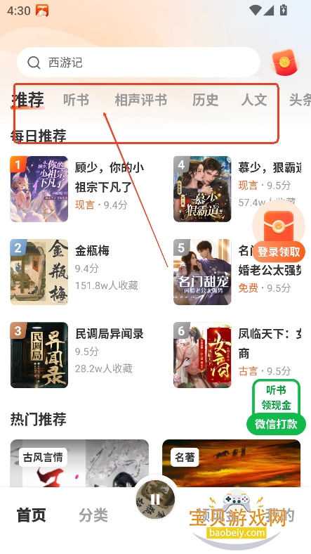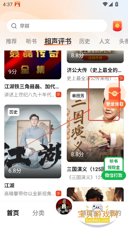1、进入首页,可以筛选听书类型,切换到喜欢的有声内容板块