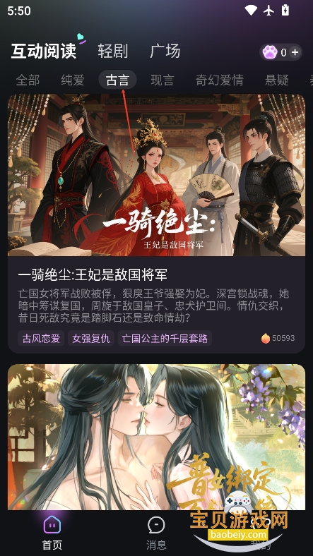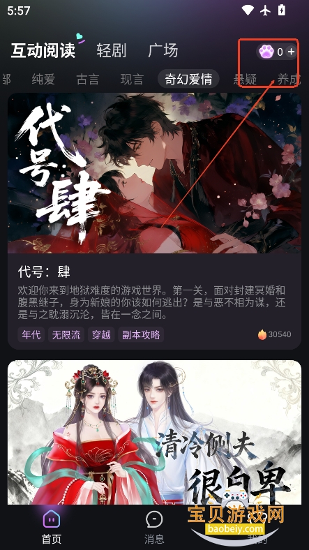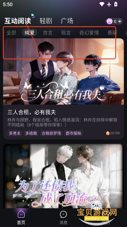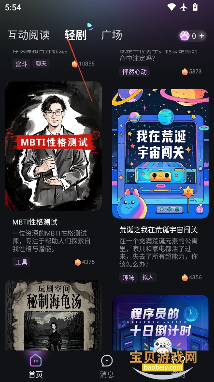 1、进入首页,提供互动阅读,轻剧,广场三个板块的内容,可以直接切换到互动阅读板块,筛选阅读分类