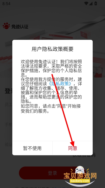 1、在宝贝游戏网下载安装兔迹认证app安卓版,点击“同意”进入界面