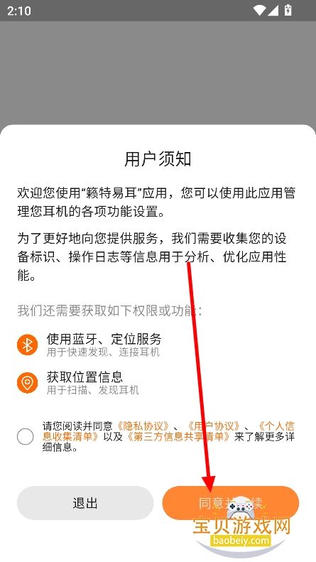 1、在宝贝游戏网下载安装籁特易耳app安卓版,点击“同意并继续”进入