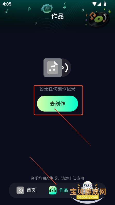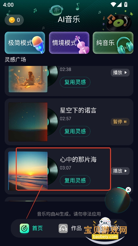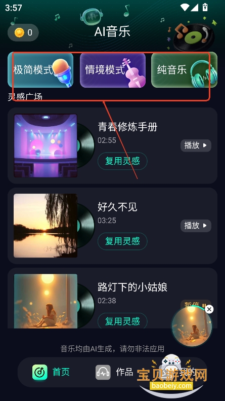 1、进入首页,根据你需要创作歌曲类型选择极简模式,情景模式,或者纯音乐