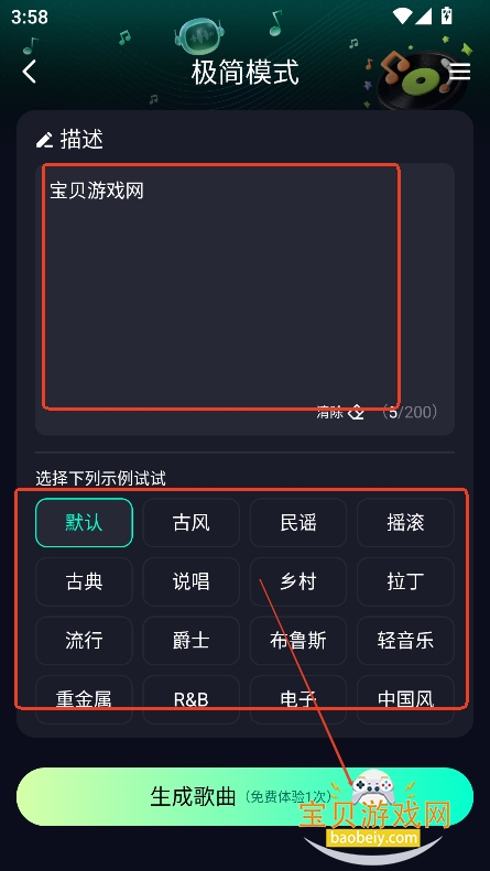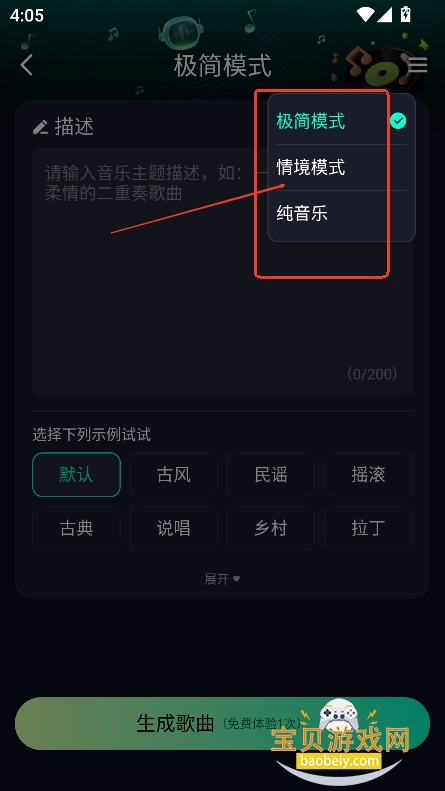2、例如进入极简模式,就非常快捷,在文本框输入歌曲描述关键词,选择歌曲风格,然后点击下方生成歌曲就可以了