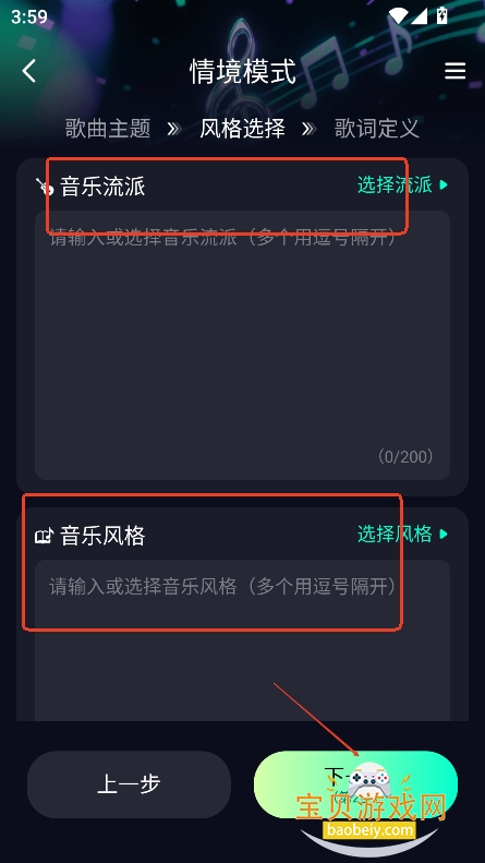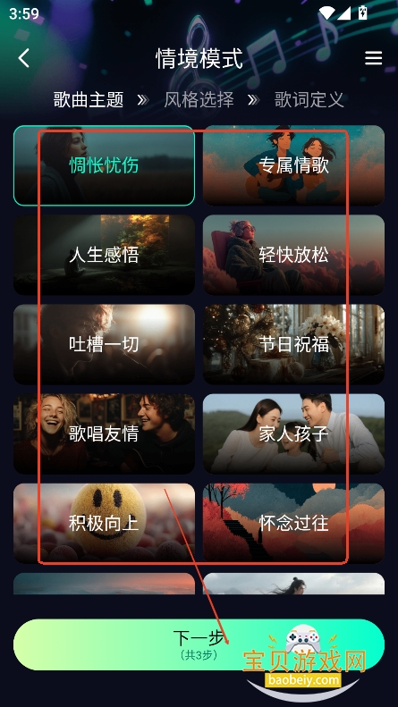 3、进入情景模式,首先选择歌曲风格,点击下一步