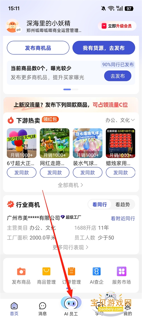 1、打开1688商家版App,登录之后,点击【AI员工】