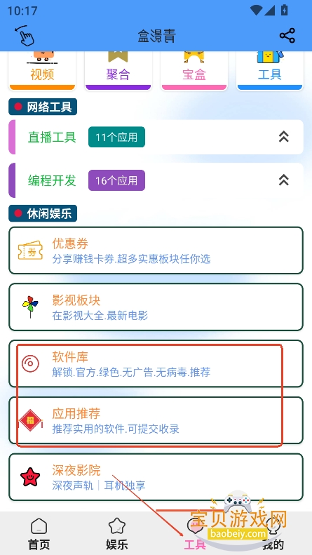 1、进入“工具板块”可以选择软件库,或者应用推荐进入