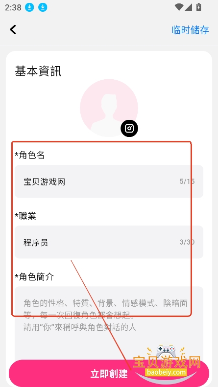 2、输入角色名称,头像,简介,以及人物设定等,点击立即创建