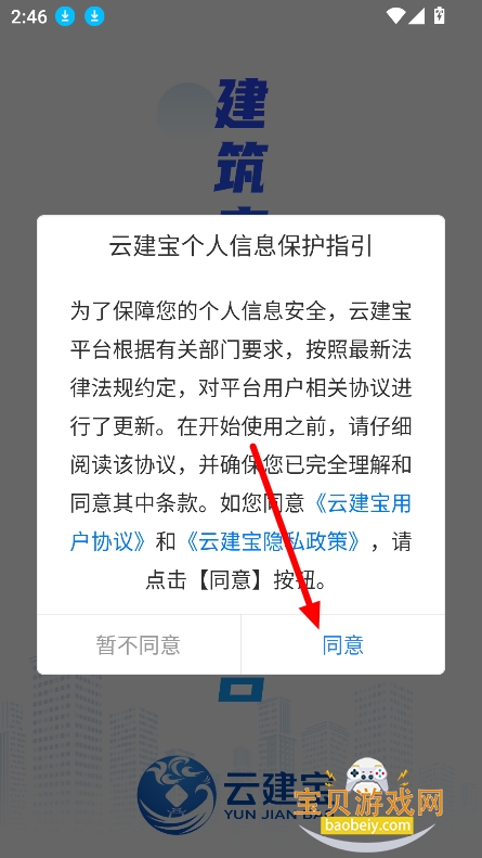1、在宝贝游戏网下载安装云建宝工人端app官方版,点击“同意”进入