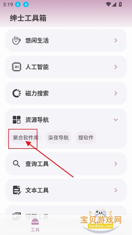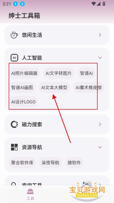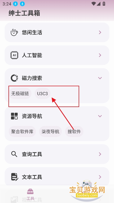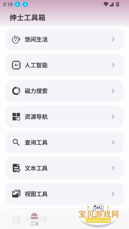 绅士工具箱2026最新版本,一款万能工具箱手机应用,主要为大家带来生活实用,影音娱乐,游戏辅助,磁力等等内容,并且所有功能板块无需跳转,另外安装,在线就能够进入使用,并且全部功能免费开放,致力于为大家带来更多玩机体验,喜欢的欢迎来宝贝游戏网下载哦!