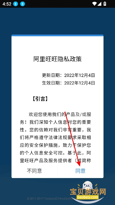 1、在宝贝游戏网下载安装旺信app手机版,点击“同意”进入