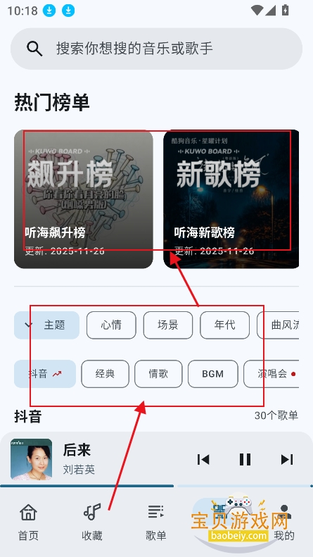 4、进入分类板块,可以根据歌曲类型进行筛选,或者查看飙升榜,新歌榜等