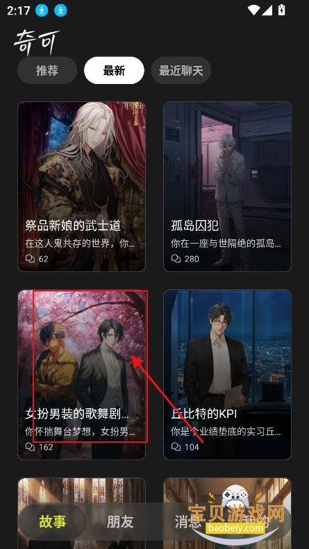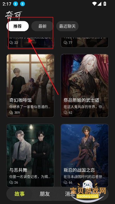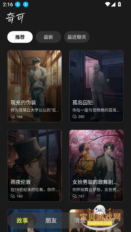 1、进入故事界面,选择喜欢的角色,提供推荐,最新等板块