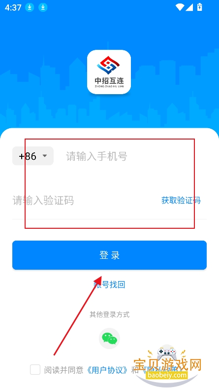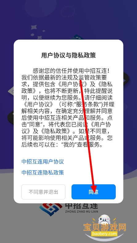 1、在宝贝游戏网下载安装中招互连app官方版,点击“同意”进入