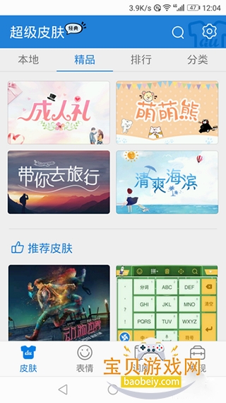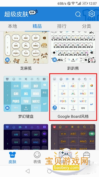 3、点击之后,输入法就会联网打开超级皮肤的页面。在这个页面中,我们可以滚动屏幕,慢慢查找自己所喜欢的皮肤。