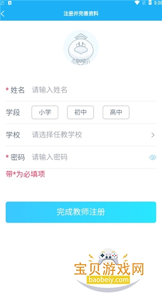 2、然后点击注册,填写各种基本资料,比如姓名,学段,学校等,然后点击完成教师注册。