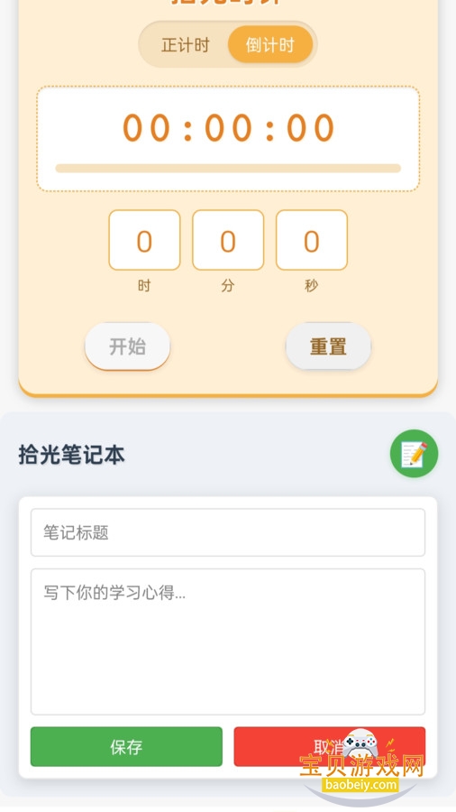 3、时间管理小工具:“拾光时钟” 支持正计时与倒计时,可用于学习、运动等场景,助力高效管理时间。“拾光笔记本” 方便记录学习心得、生活感悟等,随时留存思绪。