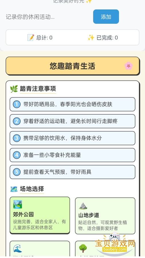 4、休闲生活好伴侣:“悠趣拾光” 可记录休闲活动,见证点滴美好。“悠趣踏青生活” 提供踏青注意事项和场地选择,让您尽情享受户外乐趣。