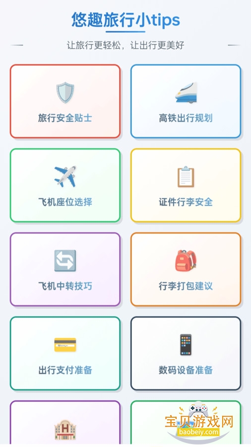 2、旅行规划好助手:“悠趣旅行小 tips” 涵盖旅行安全、高铁出行、飞机选座等全方位攻略,无论是证件行李准备,还是行李打包建议,都能为您的出行保驾护航,让旅行轻松无忧。