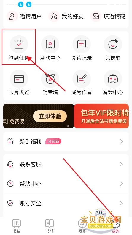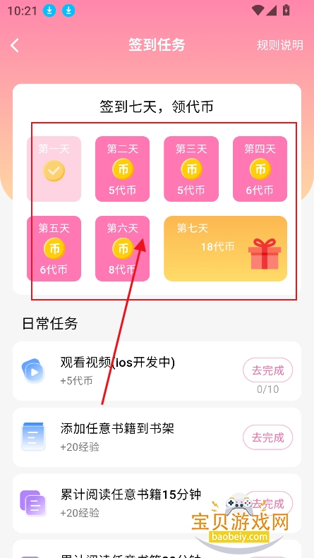 2、进入签到任务界面,点击签到,可以领取每日签到金币