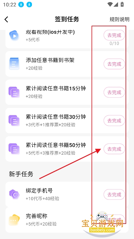3、往下浏览,点击任意一项任务,点击去完成,也可以获得对应金币