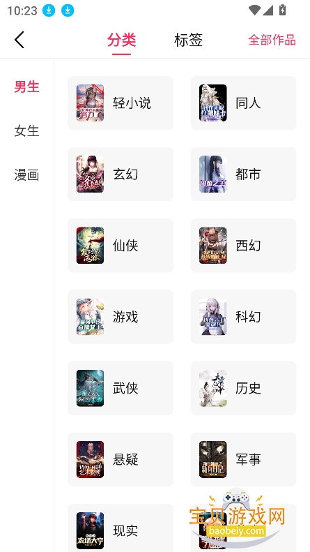 2、点击分类进入,可以根据分类,题材进行小说内容少选