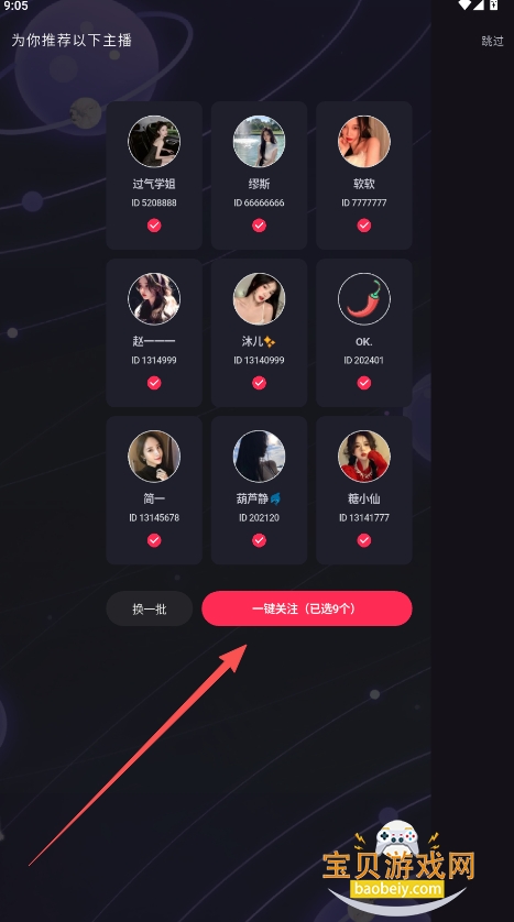 3、登录后,系统会为根据大数据用户习惯智能推送一批主播,可点选部分关注也可以关注全部。