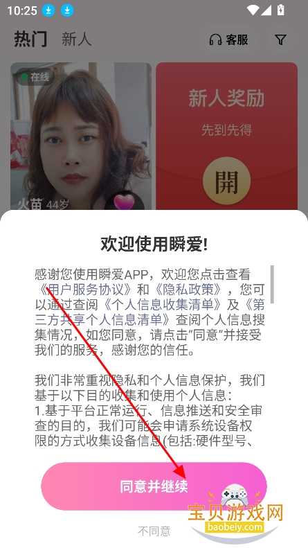 1、在宝贝游戏网下载安装瞬爱官方版,点击同意并继续,进入首页
