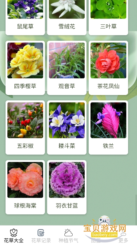 1、进入首页,可以查看花草大全,上下浏览可以查看不同品种的花草