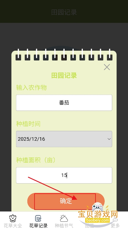 2、输入农作物名称,种植时间,以及种植亩数,点击确定