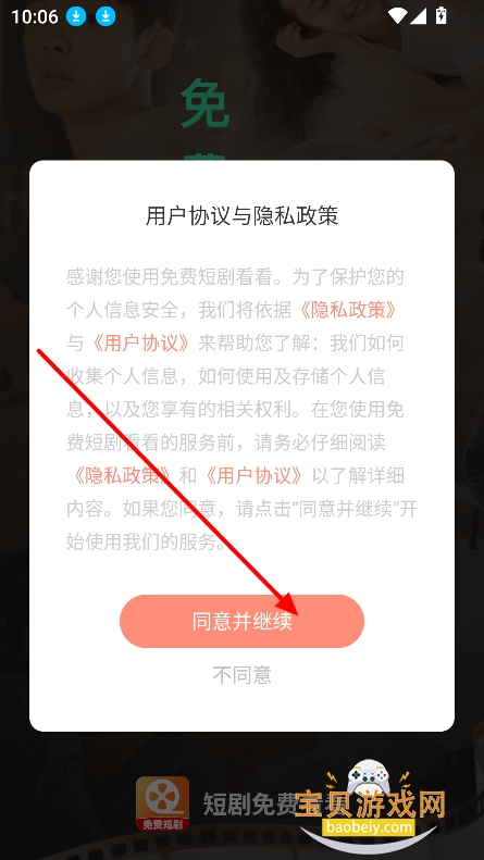 1、在宝贝游戏网下载安装免费短剧看看app手机版,点击同意并继续进入