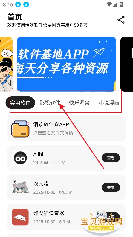 1、进入首页,可以筛选喜欢的软件资源类型,覆盖实用,影音娱乐,小说漫画等