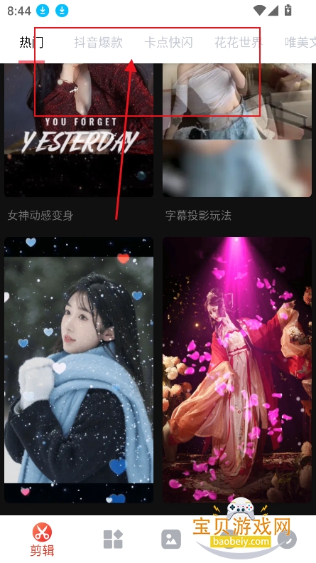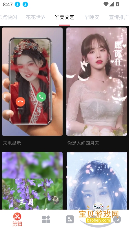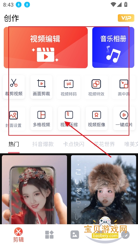 1、进入剪辑页面,提供超多剪辑工具,例如视频剪辑,音乐相册,画面编辑等功能,可以任意选择你需要的视频功能