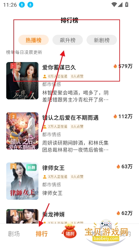 3、进入排行板块,可以查看热播榜,飙升榜,新剧榜等