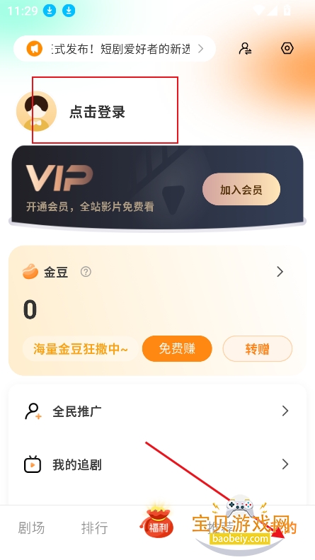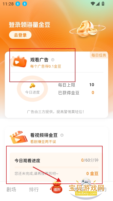 1、进入福利界面,可以观看广告,或者是完成追剧任务,就可以兑换相应金豆