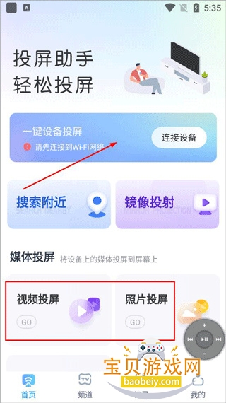1、打开手机投屏神器appapp,进图主界面,首页可以找到一键设备投屏的功能,也可以进行镜像投射,这个功能支持视频、照片、音乐投屏。