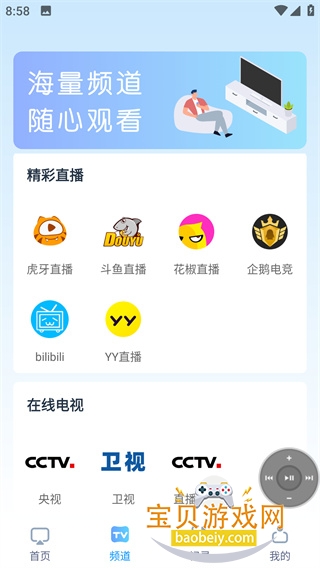 3、也可以打开频道,这个板块可以播放各个平台的精彩直播和电影电视剧,如虎牙、斗鱼直播等;