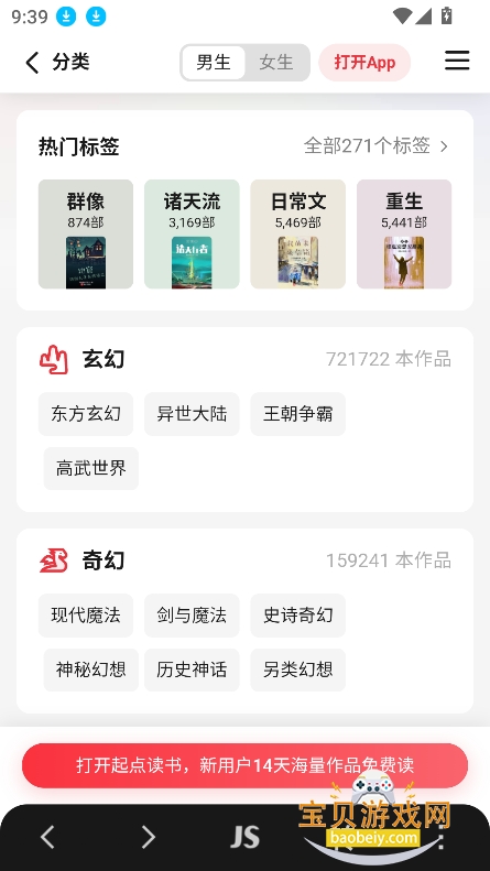 3、进入小说网址界面,筛选喜欢的阅读标签