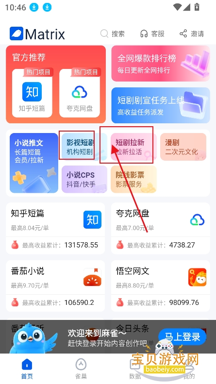 麻雀matrix短剧推广最新版,一款时下超火爆的短视频推广平台,深度整合影视公司正版资源与AI创作工具,无论是利用碎片化时间接单的兼职用户,还是追求高效产出的专业剪辑师,都能通过标准化授权流程获取优质素材,借助智能工具降低创作门槛,最终实现抖音、快手等主流平台的流量变现。