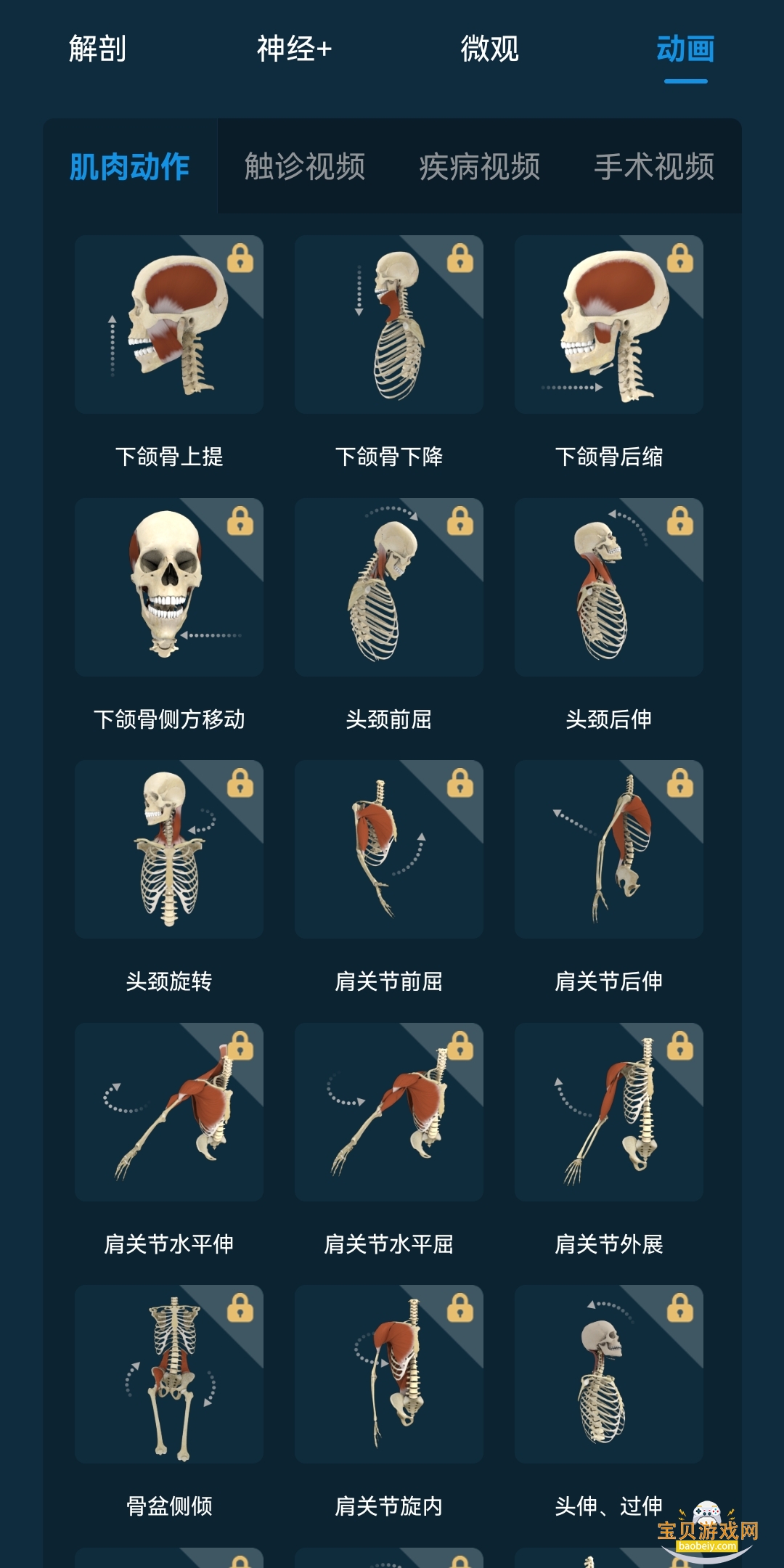 3D肌肉动作包括下颌骨上提、下降、后缩,侧移等动画,头颈部、肩关节、骨盆、肘关节、脊柱等相关动作 74 个、触诊视频包括三角肌、冈上肌、小圆肌等 48 个;