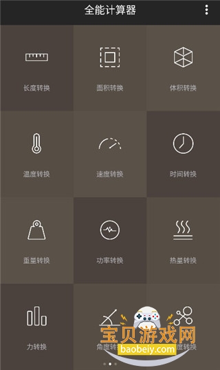 1、大家安装进入之后可以看到这款计算器拥用三页功能,用户可以在这里找到各种能够计算的“单位”;