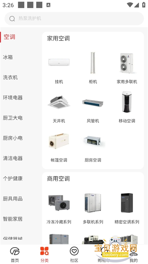 2、也可以点击首页下方导航栏的分类,选择大类别(如空调),再选子类(如挂机空调)