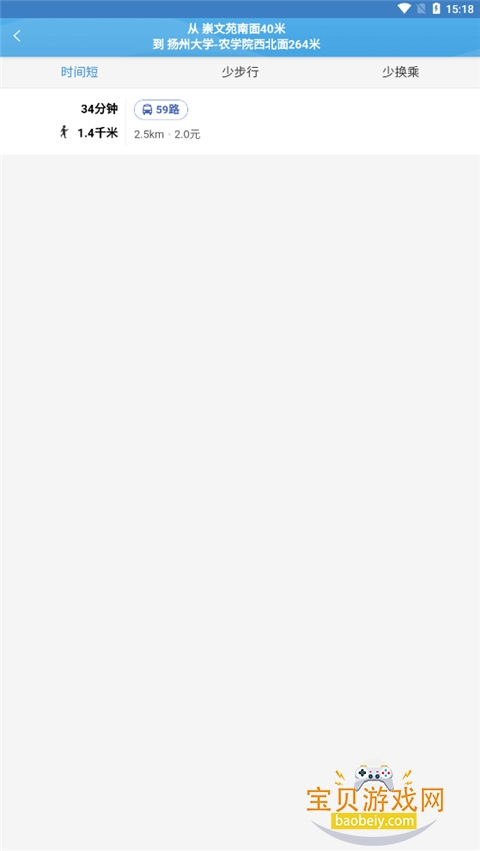 用户可以通过首页点击下面 “导乘”进入导乘查询页面。输入乘车起点站、终点站,点击搜索,进入查询结果页面,查询结果显示多种方案,有直达的。