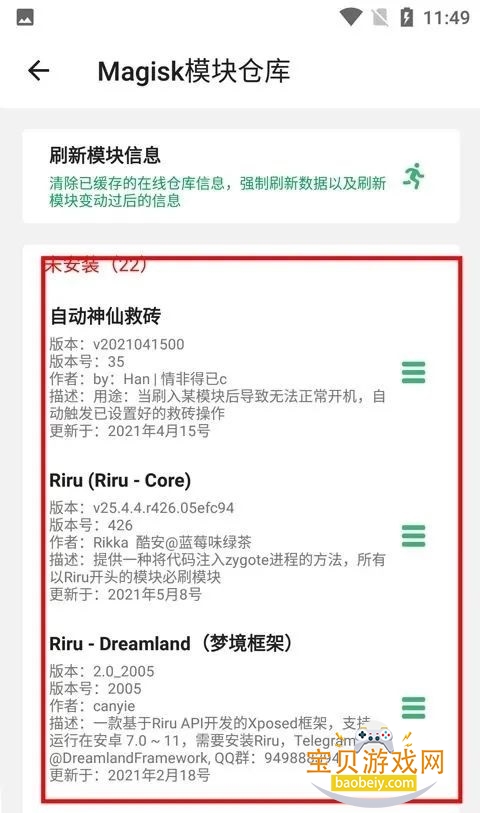 2、进入到magisk模板仓库之后,这里有很多功能框架,选择你需要的;