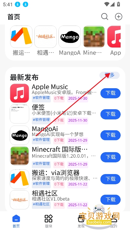 1、进入首页,可以查看最新更新的软件,或者点击查看更多