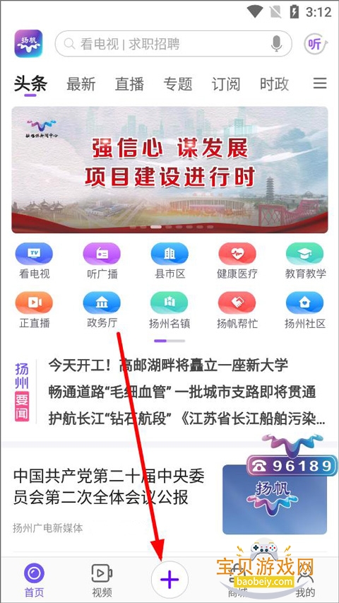 1、打开扬帆App,登录进入首页,用户可在首页查看头条新闻、看电视、听广播、生活服务等,点击“+”;