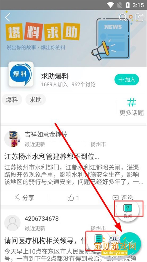 3、进入爆料页面,用户可查看其他用户提出的爆料以及求助内容,点击右侧“+”选择发布文章或提问;
