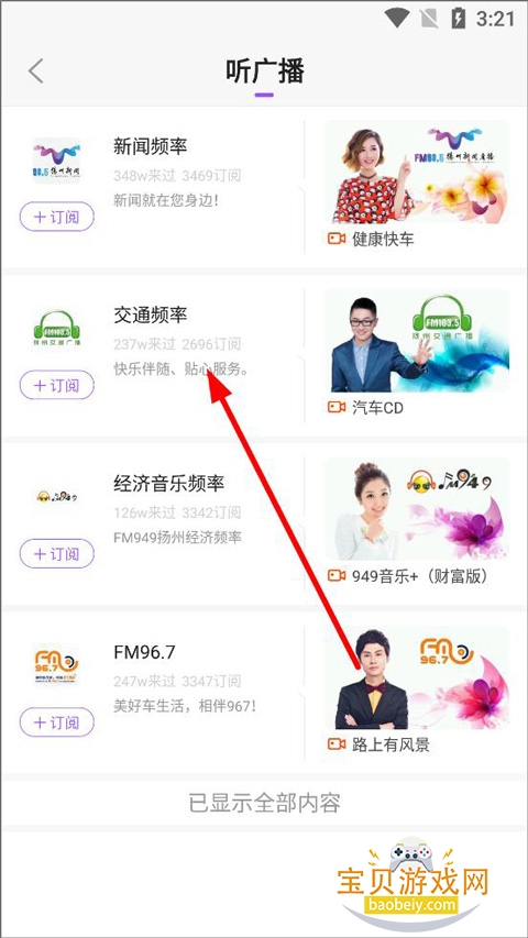 2、进入听广播页面,有新闻频率、交通频率、经济音乐频率等,用户选择自己需要收听的广播;