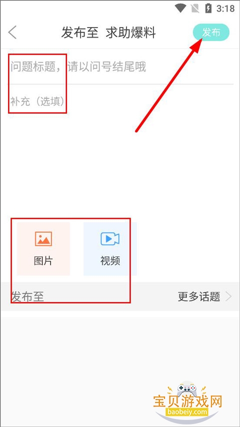 5、打开提问页面,用户需要填写问题标题、问题补充内容、图片、视频等,点击右上角发布即可。