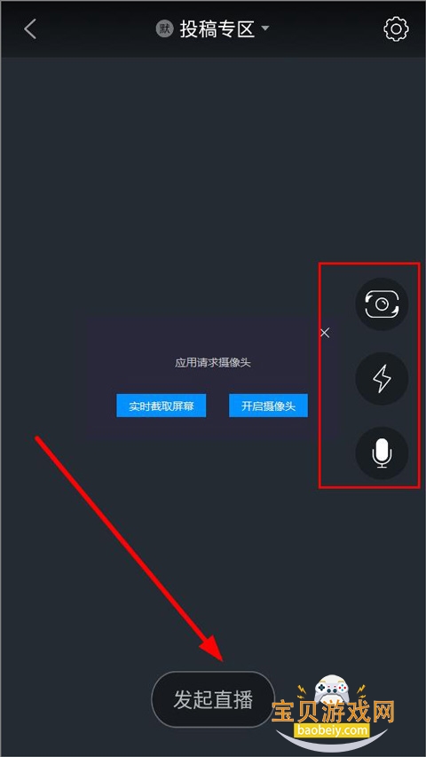 2、开启摄像头,用户可设置镜头、闪光灯和语音,点击发起直播;
