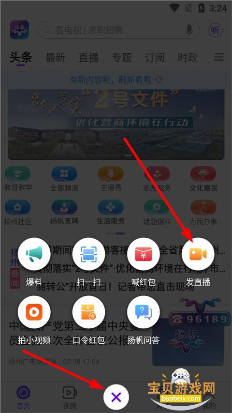 1、打开扬帆App,登录进入首页,用户可在首页查看扬州新闻、社区志愿服务、生活服务等,点击“+”,选择发直播;