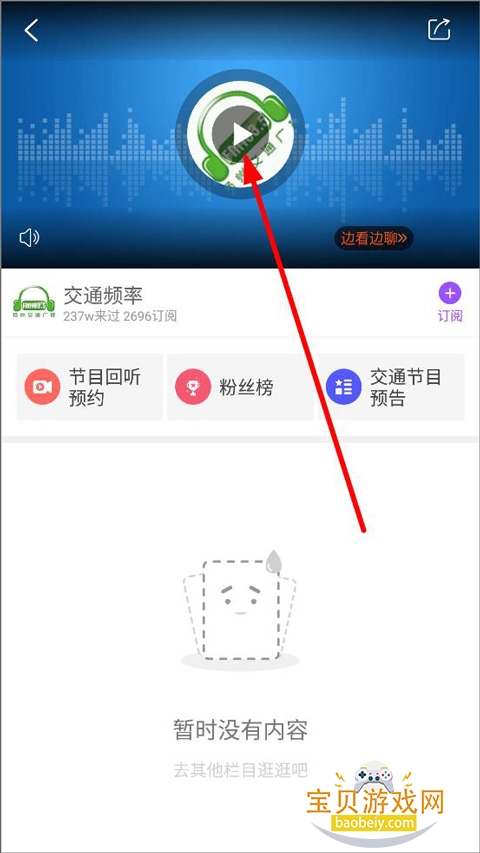 3、打开广播收听页面,用户可订阅广播、节目回听预约、查看粉丝榜和节目预告,点击播放键即可收听广播。